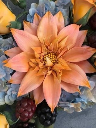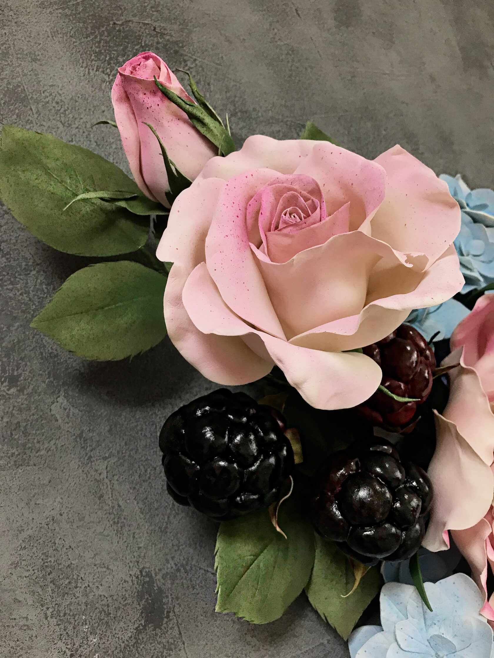 Соберем удивительную картину из ежевики и реалистичных цветов: скабиозы, кустовой розы, гортензии и зелени.